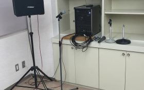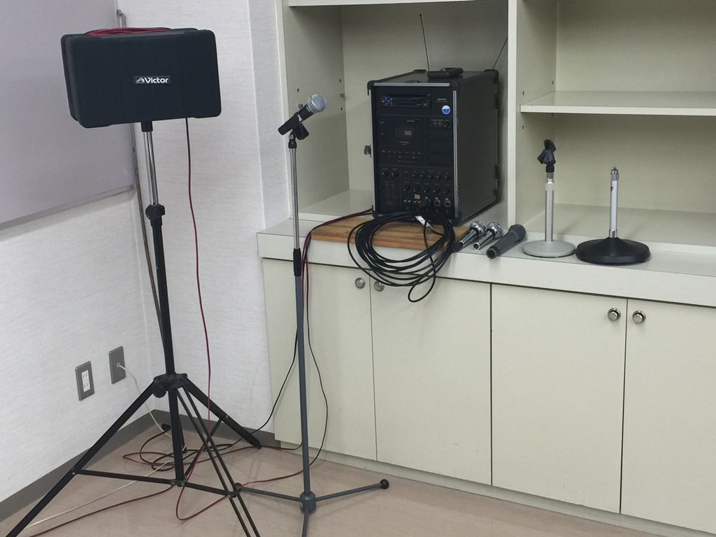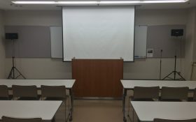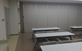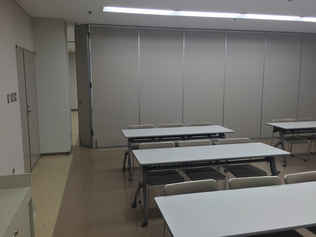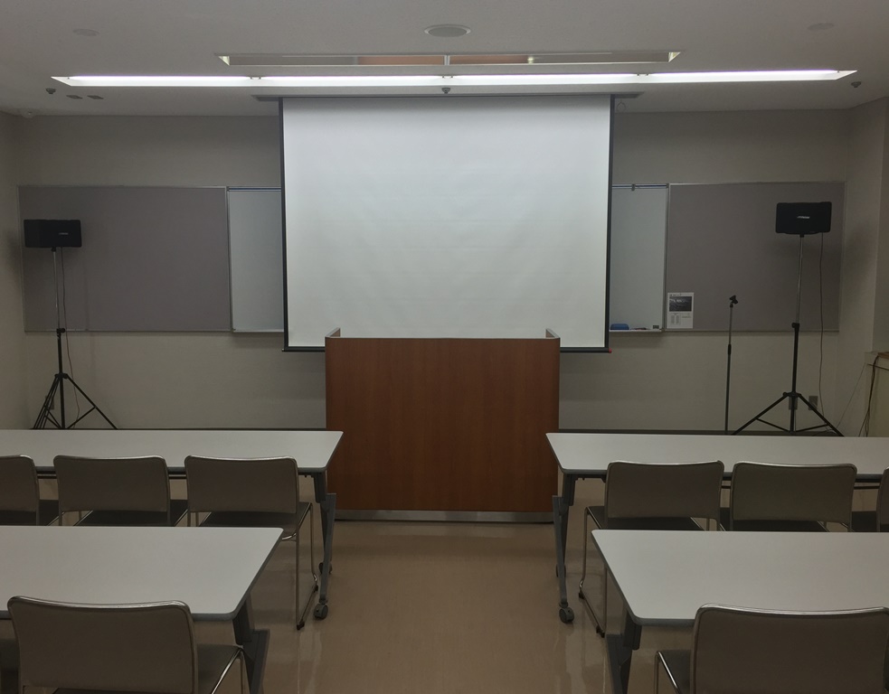 天吊り型スクリーン、演台 パーティション使用例 音響機器 定 員 48人(予備の机、イスはございません。) 常設附属設備 ホワイトボード・スクリーン・演台(無料) 主なオプション附属設備 拡声装置(ワイヤレスマイク1本、有線マイク3本、1,700円) プロジェクター小(3,300円) ディスプレイ(40インチ、1,100円) 特 徴 パーティション利用で2室として利用可能 冷暖房 別料金(室使用料の30%) 略図(縮尺約1/50)